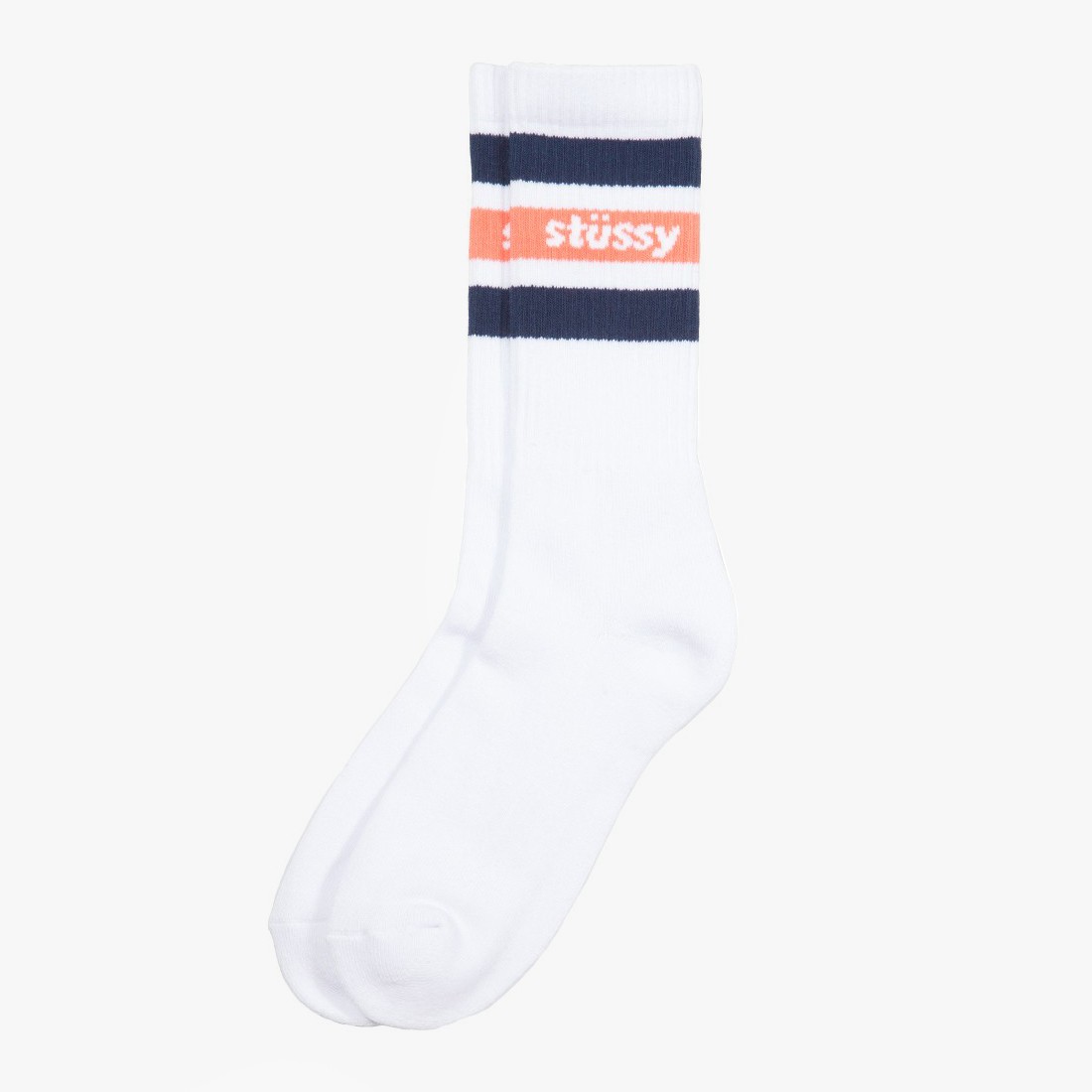Calcetines para hombre Stüssy Stripe Crew con contraste de rayas de color blanco y azul marino. Punta y talón reforzados. Composición: 80% Cotton 17% Polyamida 3% Elastane.